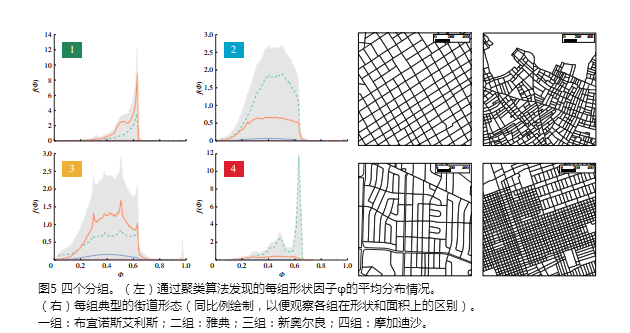 他們將那些城市地塊的尺寸、形狀繪制出來(lái):有些城市的地塊形狀統(tǒng)一;另一些則有更多小型、曲線圍成的地塊。他們比較了地塊的不同分布,將眾多城市劃入四個(gè)不同“組別”: