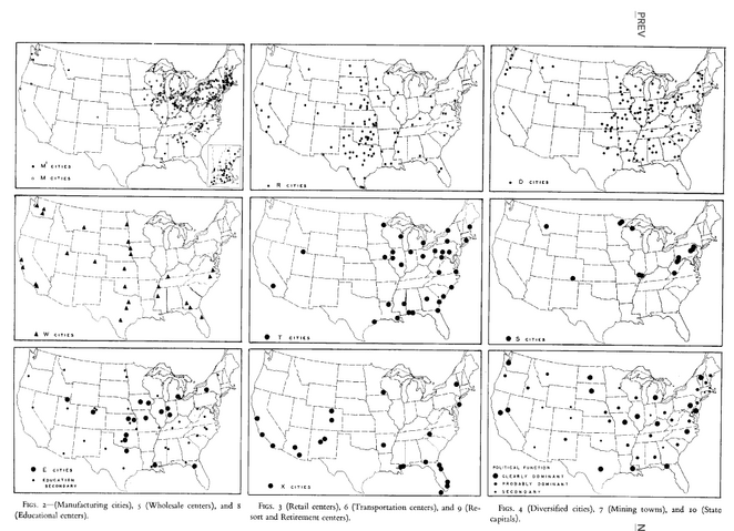 自上而下分別為,美國(guó)⑴制造業(yè)城市⑵批發(fā)中心城市⑶教育中心城市⑷零售中心城市⑸交通樞紐城市(鐵路和港口)⑹退休和度假勝地⑺“多功能”城市(貿(mào)易與制造業(yè)同等發(fā)展,但皆非占據(jù)主要地位)⑻礦產(chǎn)城市⑼州首府的分布情況。