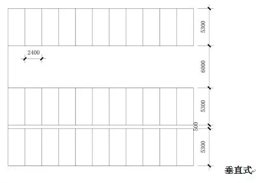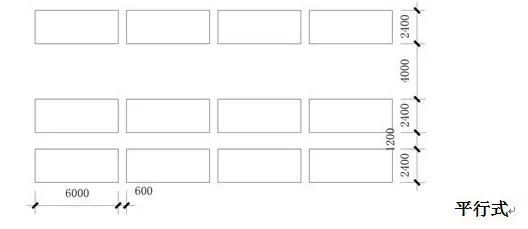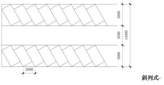 根據地形條件以占地面積小、疏散方便、保證安全為原則,主要停車方式有平行式、斜列式、垂直式三種。其中間最小距離以小型車為例,停車方式見下圖