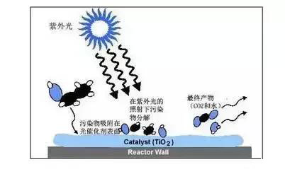 原理:光催化劑納米粒子在一定波長的光線照射下受激生產(chǎn)電子空穴對,空穴分解催化劑表面吸附的水產(chǎn)生氫氧自由基,電子使其周圍的氧還原成活性離子氧,從而具備極強的氧化還原能力,將光催化劑表面的各種污染物摧毀。