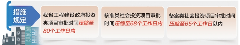 根據(jù)《若干措施》規(guī)定,河北省工程建設(shè)政府投資類項(xiàng)目審批時間壓縮至80個工作日內(nèi),核準(zhǔn)類社會投資項(xiàng)目審批時間壓縮至68個工作日內(nèi),備案類社會投資項(xiàng)目審批時間壓縮至65個工作日以內(nèi)。