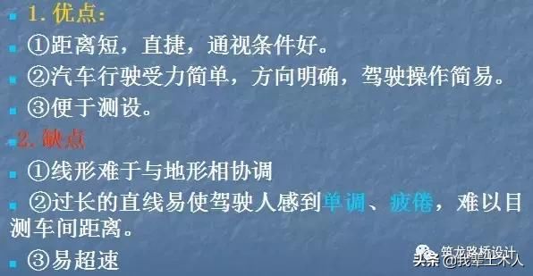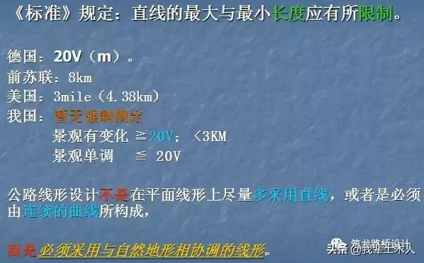公路線形應(yīng)與地形相適應(yīng),與景觀相協(xié)調(diào),直線的最大長度應(yīng)有所限制,當(dāng)采用長的直線線形時,為彌補(bǔ)景觀單調(diào)的缺陷,應(yīng)結(jié)合具體情況采取相應(yīng)的技術(shù)措施。
