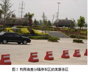 規(guī)劃應(yīng)考慮按照不同車輛的停車要求將停車場進(jìn)行合理劃分,較合理的劃分應(yīng)該是:客車區(qū)、小轎車區(qū)、貨車及超長車區(qū)及特種車區(qū)。根據(jù)這四類不同車輛的不同要求,規(guī)劃停車區(qū)和牽出道,嚴(yán)禁客貨混停,防止超長車倒車停放。各區(qū)之間用綠島隔離,達(dá)到美化遮陽的效果;或者利用地形高差自然分隔,也可以防止不同類型車輛混停,這在我們調(diào)研中就有很好的一例(如圖5所示)。停車場可盡量做大,隔離島要少而小,避免影響停車和交通,要盡可能留有發(fā)展余地,所需土地可一次征用,分期擴建,初期可暫以綠地替代。