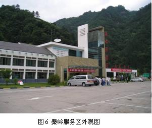 受占地空間的限制,服務(wù)區(qū)內(nèi)會最大程度地增加建筑面積和停車場面積,如服務(wù)區(qū)規(guī)劃設(shè)計充分利用原地貌、地物資源,結(jié)合周邊地理環(huán)境進(jìn)行設(shè)計,這實際上將是對自然環(huán)境的開發(fā)和保護(hù),如圖6所示西漢高速公路的秦嶺服務(wù)區(qū)即為一例。