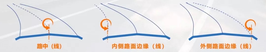 另外一個(gè)就是軸線,為了保證超高過(guò)渡的平穩(wěn)連續(xù),需要在路面的三個(gè)軸線,也就是路中線、內(nèi)存路面邊緣線或外側(cè)路面邊緣線將路面進(jìn)行旋轉(zhuǎn)。從而達(dá)到雙向橫坡果斷到單向橫坡的目的。
