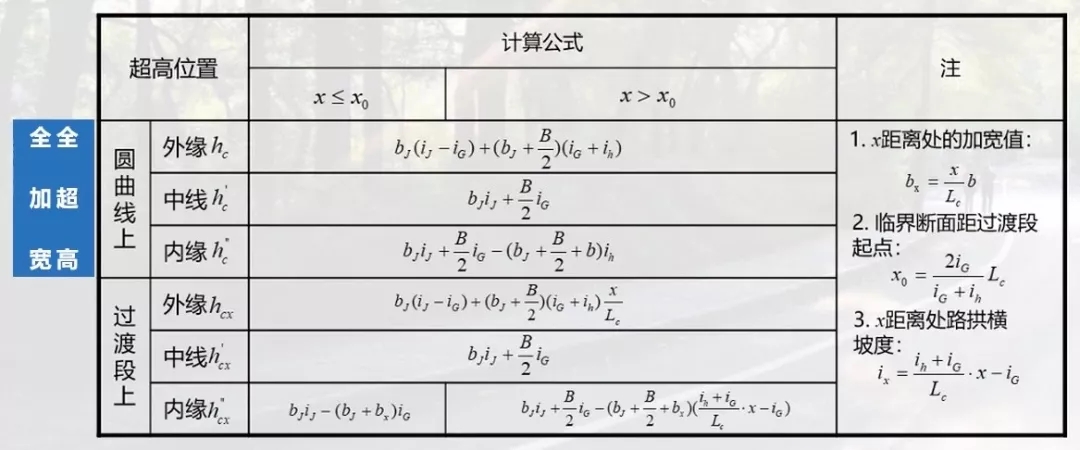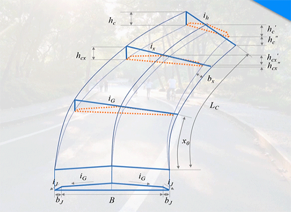 雖然超高計(jì)算圖示里有很多參數(shù),但是大家需要了解其中三個(gè)重要的參數(shù),分別是ix(x距離處路拱橫坡度)、bx(x距離處路基加寬值)和x0(與路拱同坡度的單向超高點(diǎn)到超高過(guò)渡段起點(diǎn)距離)。