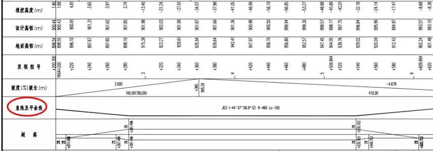 路基設(shè)計(jì)表:為便于施工,平曲線設(shè)計(jì)超高后,道路中線和內(nèi)、外側(cè)(路肩)邊緣線與設(shè)計(jì)高程之差應(yīng)列于路基設(shè)計(jì)表中。計(jì)算時(shí)需要按照超高過(guò)渡段、全超高段分別計(jì)算中線、內(nèi)緣及外緣的高程。