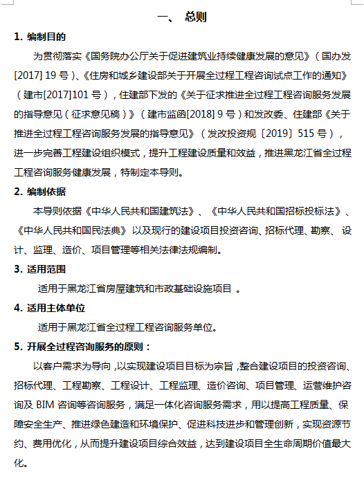 為貫徹落實(shí)《國務(wù)院辦公廳關(guān)于促進(jìn)建筑業(yè)持續(xù)健康發(fā)展的意見》(國辦發(fā)[2017]19號)、《住房和城鄉(xiāng)建設(shè)部關(guān)于開展全過程工程咨詢試點(diǎn)工作的通知》(建市[2017]101號),住建部下發(fā)的《關(guān)于征求推進(jìn)全過程工程咨詢服務(wù)發(fā)展的指導(dǎo)意見(征求意見稿)》(建市監(jiān)函[2018]9號)和發(fā)改委、住建部《關(guān)于推進(jìn)全過程工程咨詢服務(wù)發(fā)展的指導(dǎo)意見》(發(fā)改投資規(guī)〔2019〕515號),進(jìn)一步完善工程建設(shè)組織模式,提升工程建設(shè)質(zhì)量和效益,推進(jìn)黑龍江省全過程工程咨詢服務(wù)健康發(fā)展,特制定本導(dǎo)則。