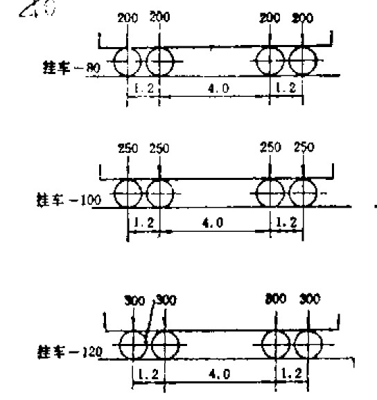 下圖是汽車車隊的縱向布置,單位是(kN),圖中可以看出汽20對應的最重車為30噸,汽超20的最重車為55噸,新聞報道中好像搞混淆了這兩個。