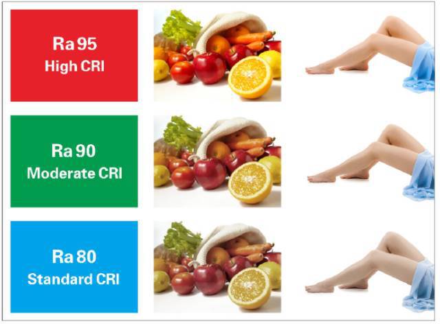 是指物體被光源發(fā)出的光照明時(shí)色彩被還原的真實(shí)程度。白熾燈的顯色指數(shù)為100,也就是說它對(duì)于色彩的還原性可以做到100%?,F(xiàn)在市面上對(duì)于LED光源的應(yīng)用越來越普及,住宅照明產(chǎn)品光源的顯色指數(shù)都應(yīng)該要大于80,優(yōu)質(zhì)LED光源的顯色指數(shù)能達(dá)到90以上甚至95,但是有一大部分的劣質(zhì)產(chǎn)品其光源的顯色指數(shù)都不到70,所以用戶在選擇的時(shí)候一定要引起注意。下面關(guān)于顯色指數(shù)的對(duì)比圖可以有一個(gè)相對(duì)直觀的感受: