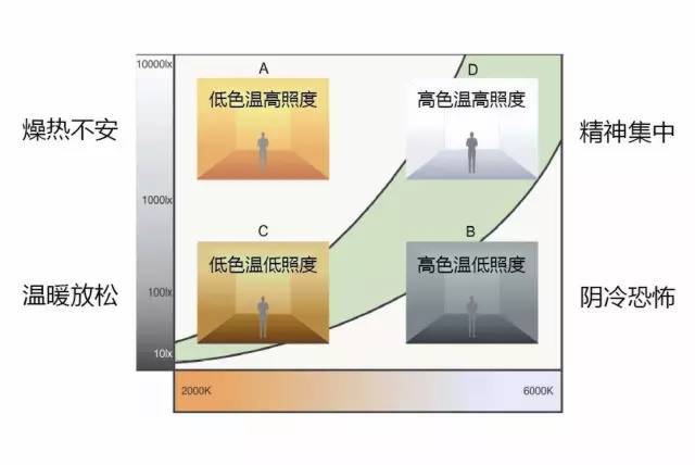 人對(duì)色溫的喜好還與照度水平有相應(yīng)的關(guān)系,不同的色溫及照度組合,會(huì)通過人的視覺令人產(chǎn)生不同的精神狀態(tài)及心理感受,所以色溫及照度組合的正確選擇是決定整個(gè)環(huán)境舒適度的基礎(chǔ)。下圖給出了不同照度水平下不 同色溫所產(chǎn)生的不同印象: