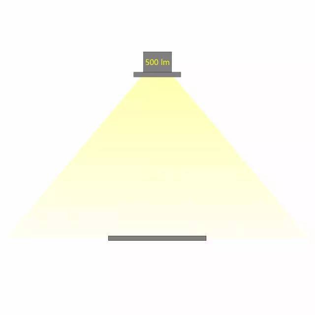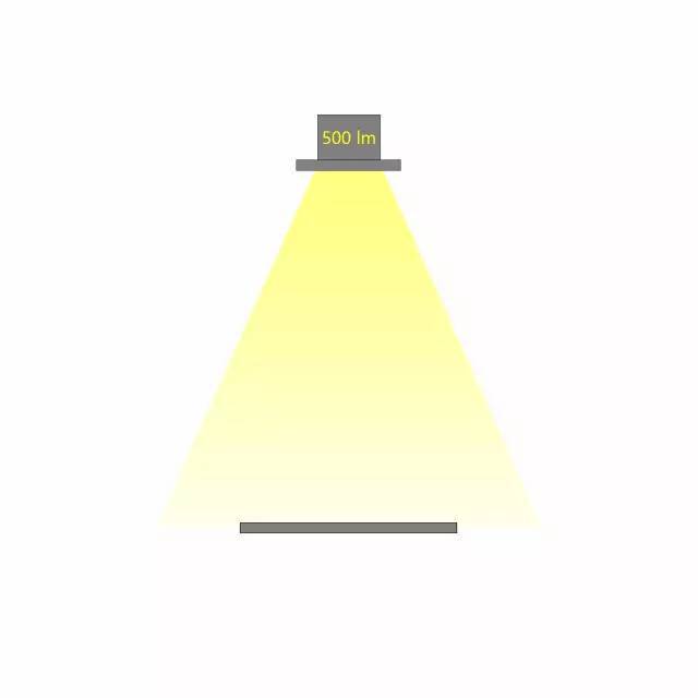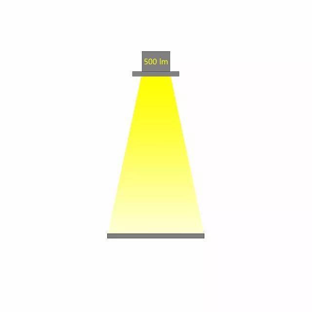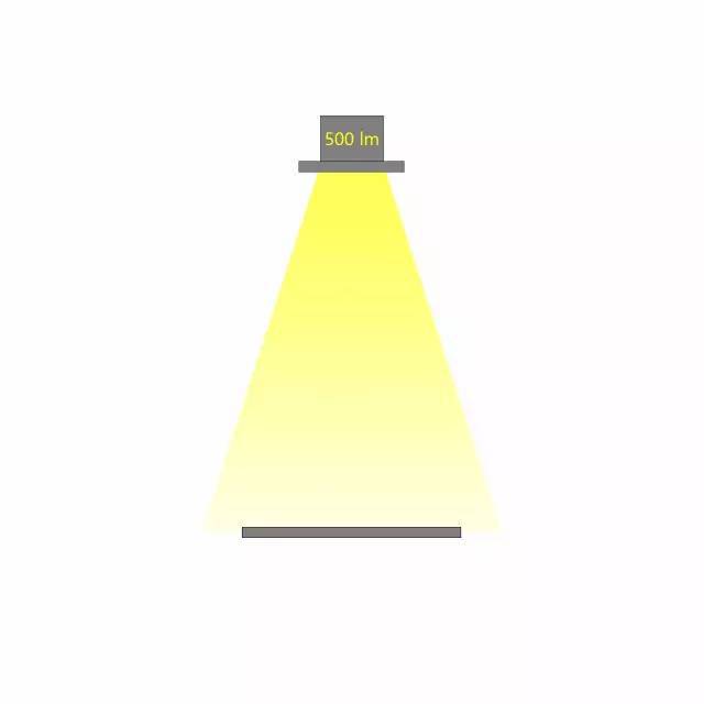 相同光通量的燈具,不同的配光角度,在相同的距離照射到同一個(gè)平面,所產(chǎn)生的照度是不同的。配光角度越大,相同距離的照度越小。如下圖,燈具的光通量為500lx,當(dāng)配光角度不同時(shí),相應(yīng)的照度也會(huì)不同。