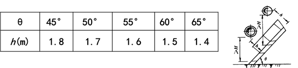 管道保溫表面與通道之間距離不小于2m。管道橫跨扶梯上空,保溫表面至扶梯傾斜面的垂直距離h,不小于表中數值。