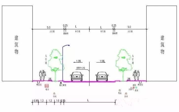 給水、消防、采暖、燃氣等壓力管道位于道路下;雨水、污水等重力流管道位于道路兩邊;電力、電信等位于人行道或綠化帶下。