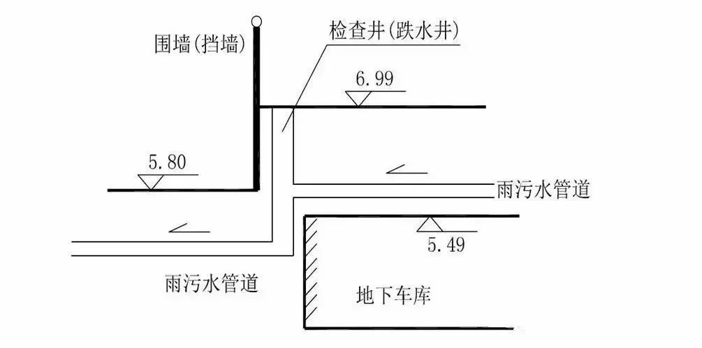 針對項目地下管線需跨越地庫、小區(qū)環(huán)路、市政道路3個標高,小區(qū)雨污水管無法直接排入市政管網(wǎng),設計上選用跌水井,如圖。