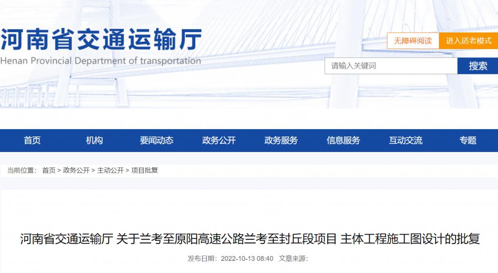10 月 13 日,河南省交通運(yùn)輸廳官方網(wǎng)站發(fā)布《關(guān)于蘭考至原陽高速公路蘭考至封丘段項(xiàng)目主體工程施工圖設(shè)計(jì)》的批復(fù)。