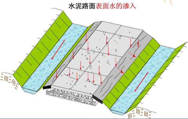 路面結構內部水的危害:浸濕各結構層材料和路基土,易造成無粘結粒狀材料和地基土的強度降低;使水泥混凝土路面產(chǎn)生唧泥,隨之出現(xiàn)錯臺、開裂和整個路肩破壞;進入空隙的自由水在行車荷載的作用下,會形成高孔隙水壓力和高流速的水流,引起路面基層的細顆粒產(chǎn)生唧泥,結果失去支承;在冰凍深度大于路面厚度的地方,高地下水位會造成凍脹,并在凍融期間降低承載能力;水使凍脹土產(chǎn)生不均勻凍脹;與水經(jīng)常接觸將使瀝青混合料剝落,影響瀝青混凝土耐久性和產(chǎn)生龜裂。