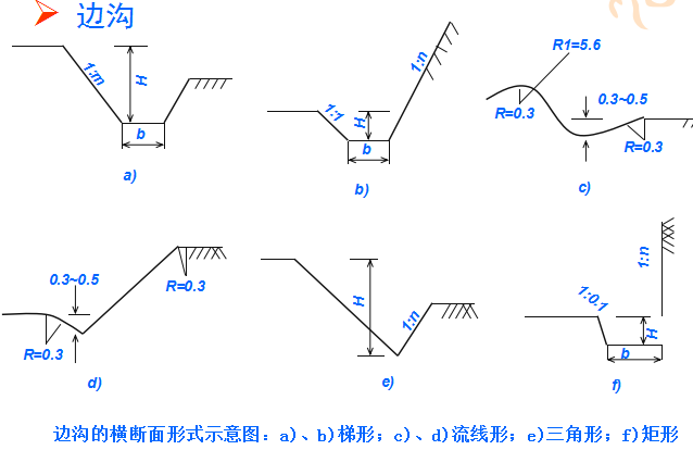 ①排水溝的橫斷面一般采用梯形,尺寸大小應經(jīng)過水力水文計算選定;