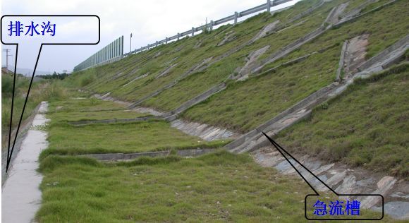 在路堤較高,邊坡坡面在未做防護而易遭受路面表面水流沖刷,或者坡面雖已采取防護措施但仍有可能受到?jīng)_刷時,應沿路肩外側邊緣設置攔水帶,匯集路面表面水,然后通過泄水口和急流槽排離路堤。