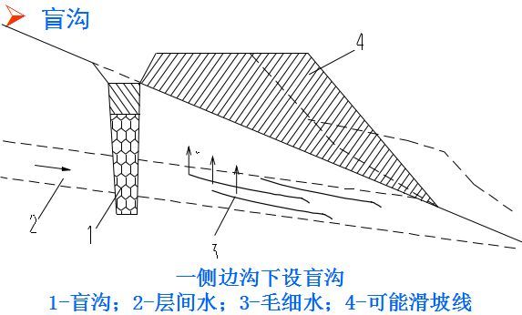 8.滲溝:利用滲透方式匯集流向路基的地下水,并通過溝底通道將水排至指定的地點,起到降低地下水位或攔截地下水。