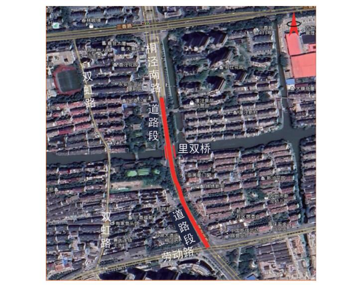 里雙橋重建工程項(xiàng)目范圍為從桐涇南路 - 三香路交叉口下穿段南到桐涇南路 - 勞動(dòng)路交叉口北側(cè),總長度 502 m。