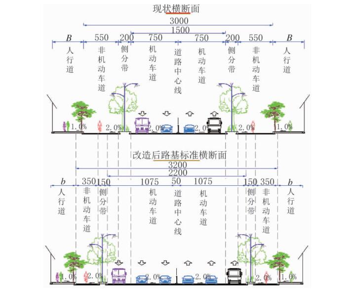 道路現(xiàn)狀為雙向四車道,三塊板斷面,橫斷面布置為 B 人行道 +5.5 m 非機(jī)動(dòng)車道 +2 m 側(cè)分帶 +15 m 機(jī)動(dòng)車道 +2 m 側(cè)分帶 +5.5 m 非機(jī)動(dòng)車道+B 人行道,B 現(xiàn)狀寬度為不小于 5.5 m。
