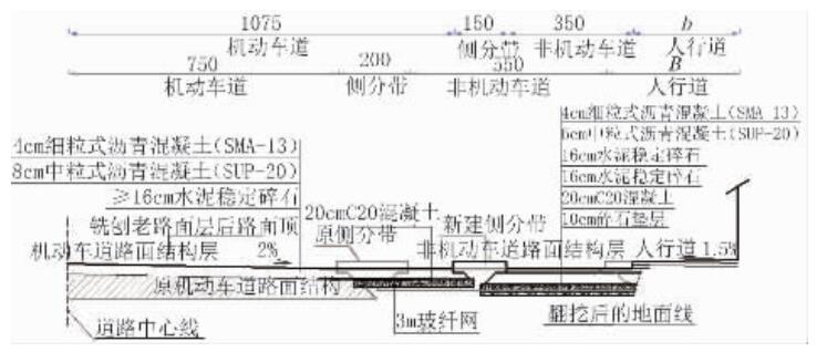 (2)針對(duì)拆除側(cè)分帶、壓縮非機(jī)動(dòng)車道改建為機(jī)動(dòng)車道段,建議采用 20 cm C20 混凝土進(jìn)行處理,新舊路基搭接頂面鋪設(shè) 3 m 玻纖網(wǎng)防止反射裂縫產(chǎn)生。