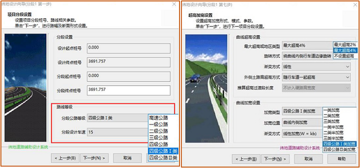 緯地軟件加寬設計功能4、集成了完整的公路設計規范指標緯地軟件支持用戶自定義各等級技術指標,用戶可根據需要,對技術標準庫進行編輯與擴充。針對《小交通量農村公路工程技術標準》,緯地軟件已于該標準發布第一時間,進行了研習,并集成了相關技術指標,用戶可根據項目等級,直接選擇小交通量道路等級,并由軟件,自動完成路幅寬度、斷面形式提取,超高加寬等自動計算。