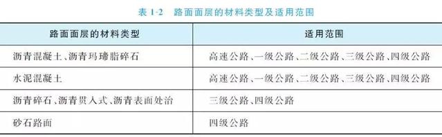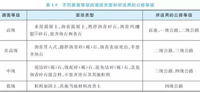 路面等級(jí)分為高級(jí)、次高級(jí)、中級(jí)和低級(jí),不同路面等級(jí)的面層類型和所適用的公路等級(jí)見表1-5。