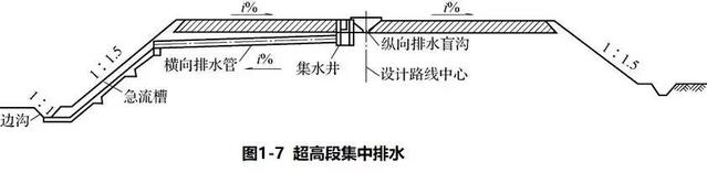 對(duì)于新建高速公路超高段的集中排水,宜采用在左側(cè)路緣帶的左側(cè)設(shè)置帶有鋼筋混凝土蓋板的預(yù)制整體式U形混凝土溝或縫隙式排水溝,每25~50 m設(shè)一處集水井,并通過橫向排水管引至邊坡的急流槽或暗管中,如圖1-7所示。
