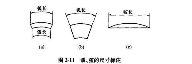 (9)圓弧尺寸宜按圖2-11(a)標注。當弧長分為數段標注時,尺寸界線也可沿徑向引出,見圖2-11(b)。弦長的尺寸界線應垂直圓弧的弦,見圖2-11(c),